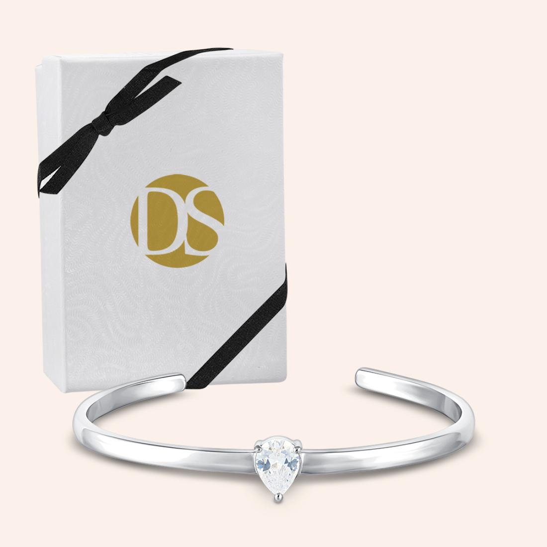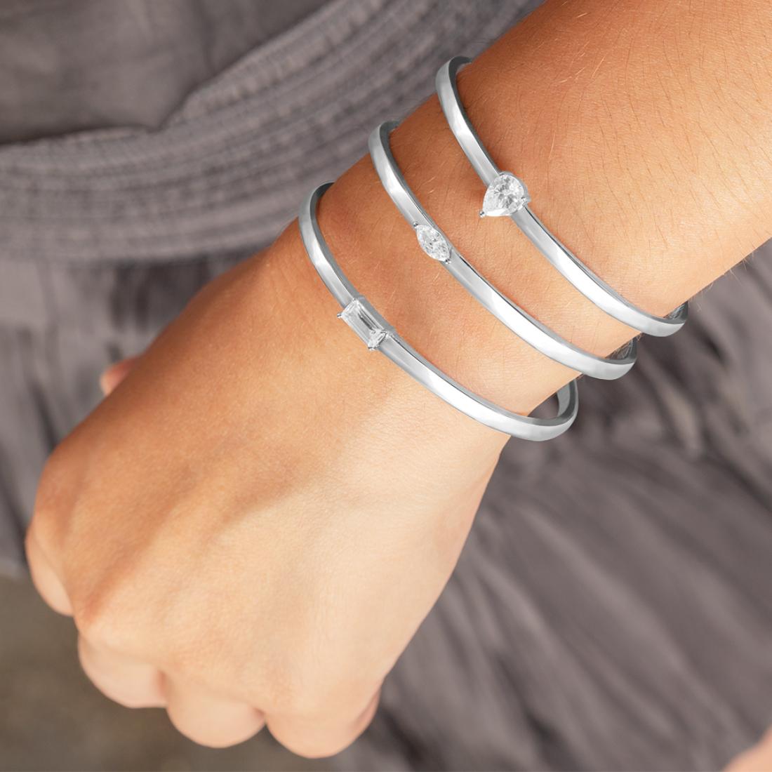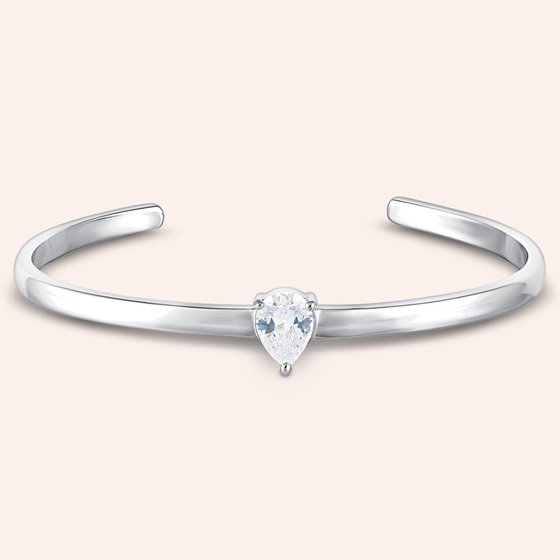 When it comes to bracelets, a well-executed cuff is a wonderful thing. This elegant and classic form showcases a Pear-cut cubic zirconia, a single one placed in the center of a highly polished cuff, catching the light and drawing in every passer-by with their distinctive sparkle.