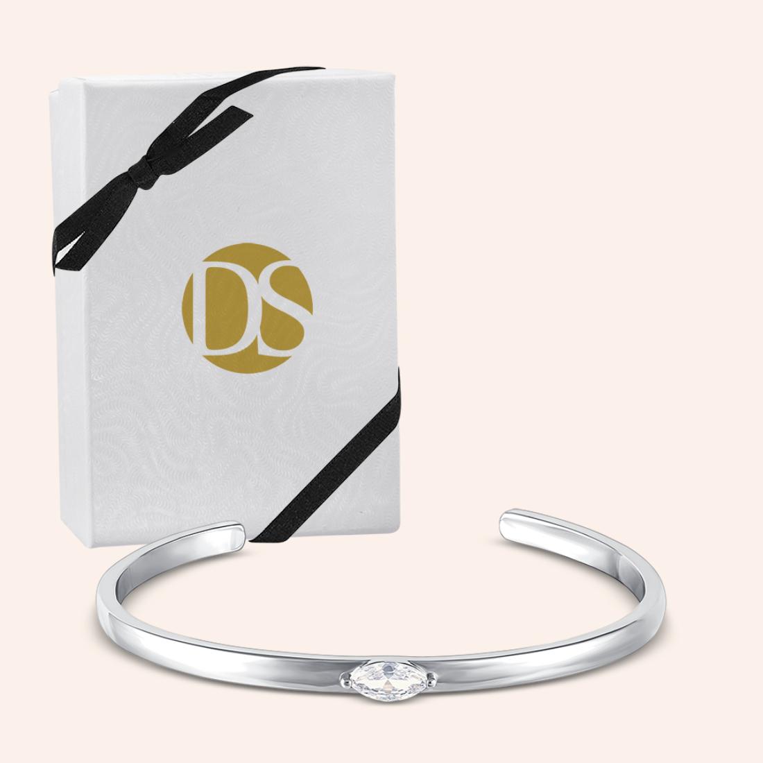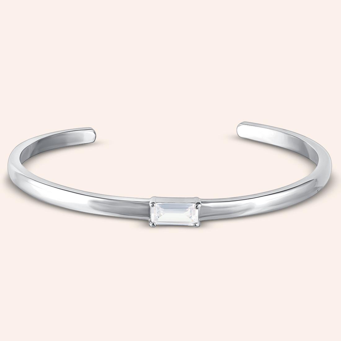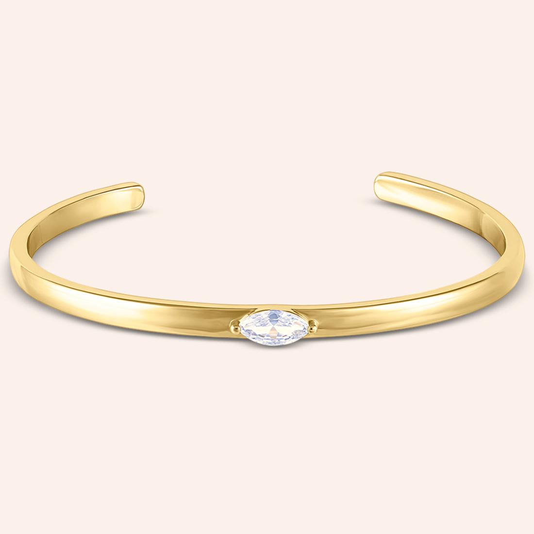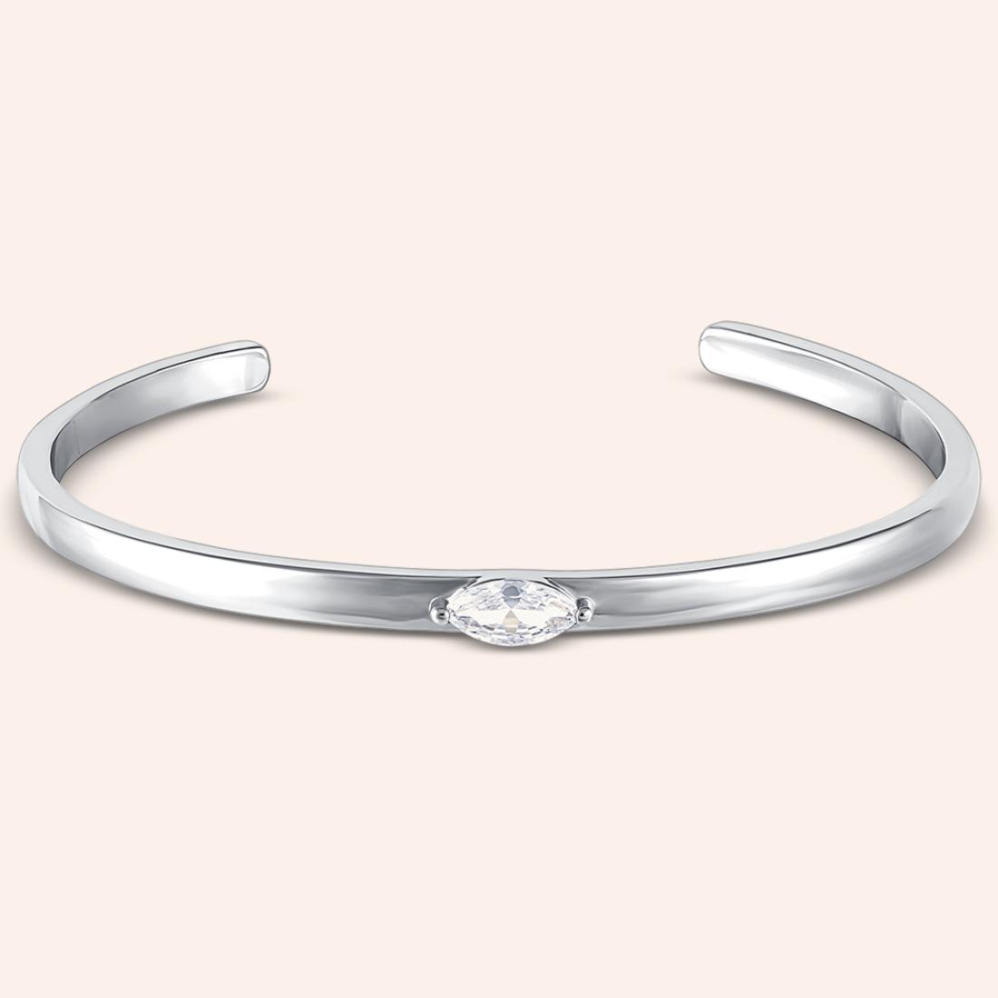 When it comes to bracelets, a well-executed cuff is a wonderful thing. This elegant and classic form showcases a Pear-cut cubic zirconia, a single one placed in the center of a highly polished cuff, catching the light and drawing in every passer-by with their distinctive sparkle.