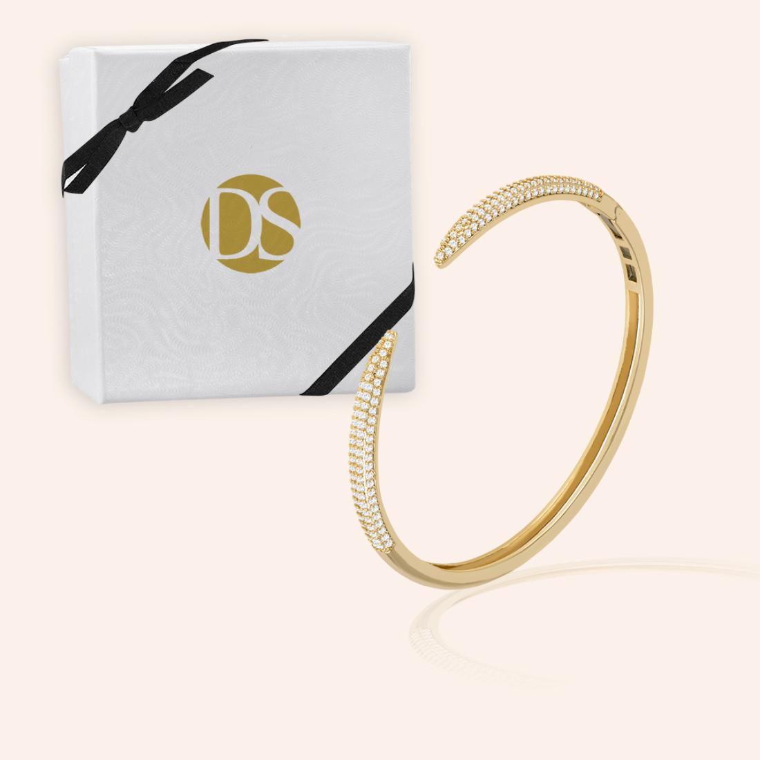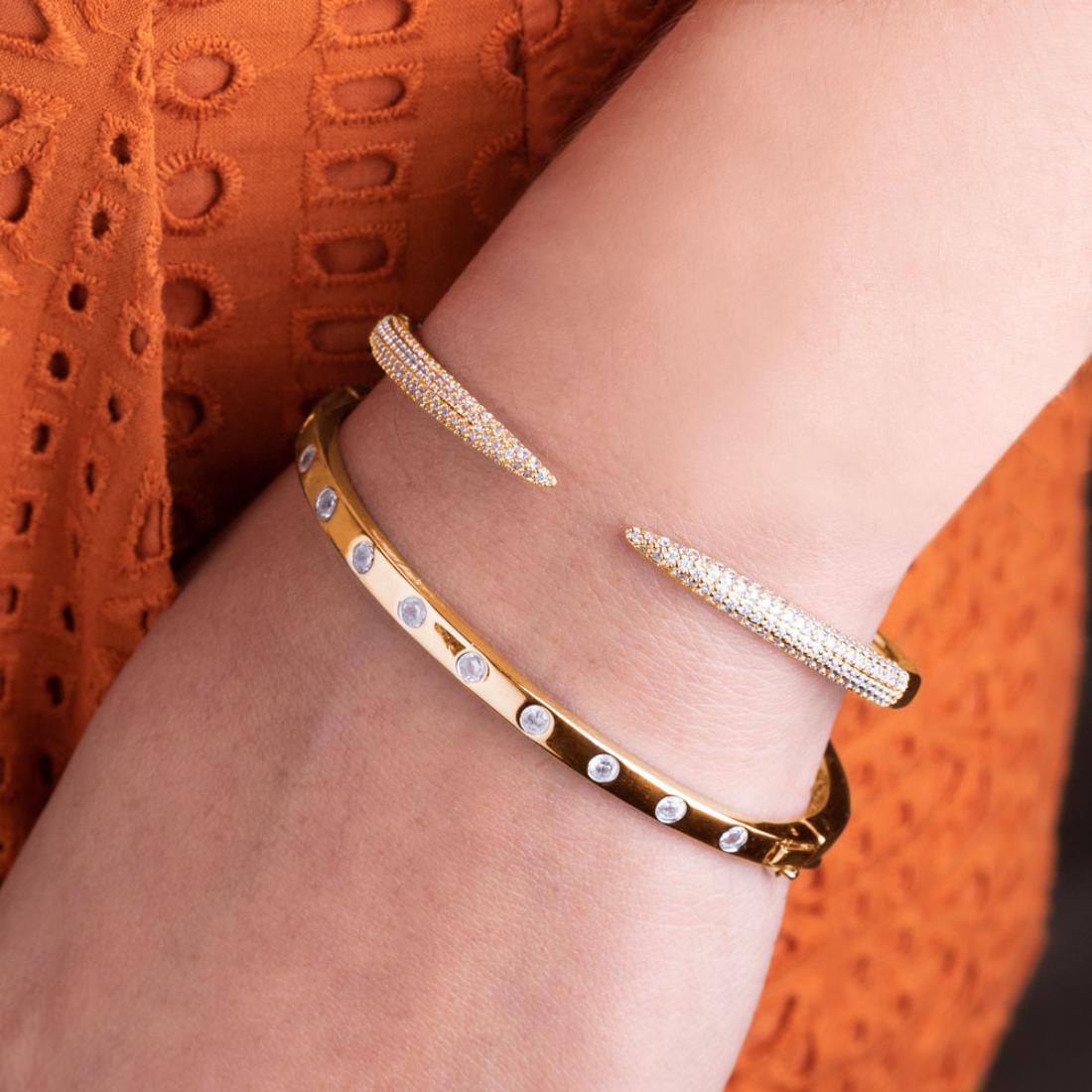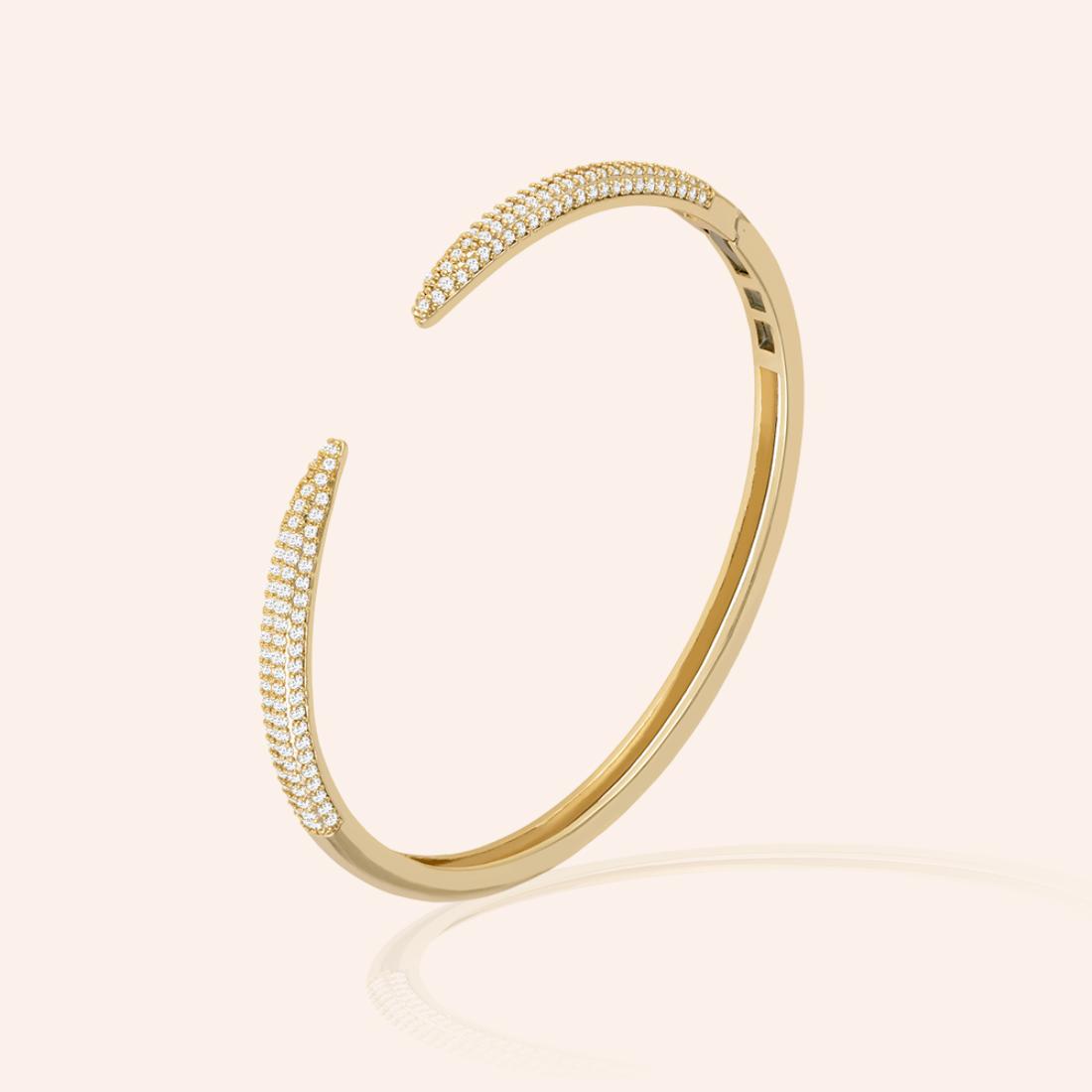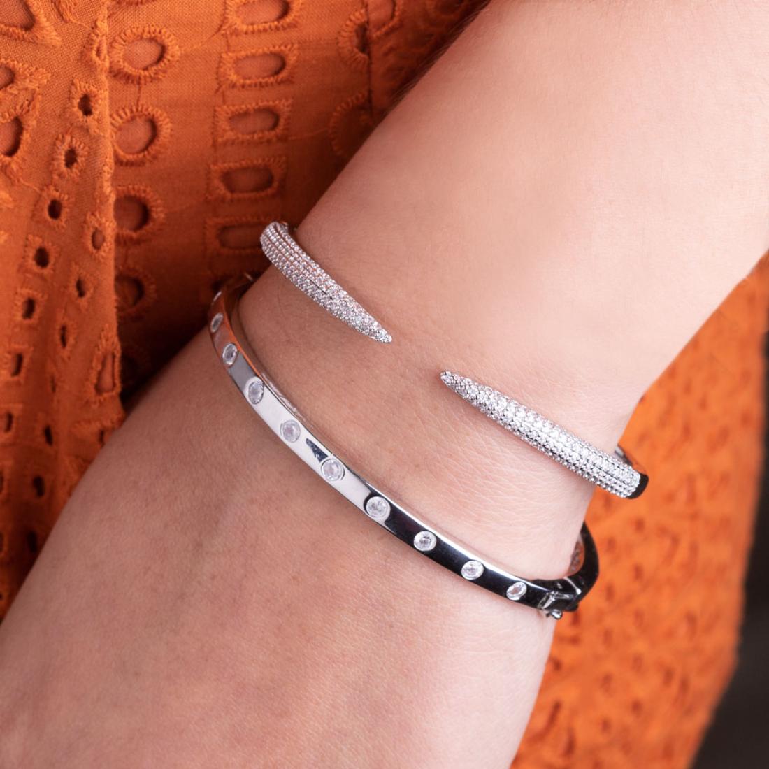 Plan for modern glamour! Start by adding this bangle's dainty and clean design to your jewelry stash. Classic shapes and an ever-versatile silhouette make it a key part of your contemporary style profile.
