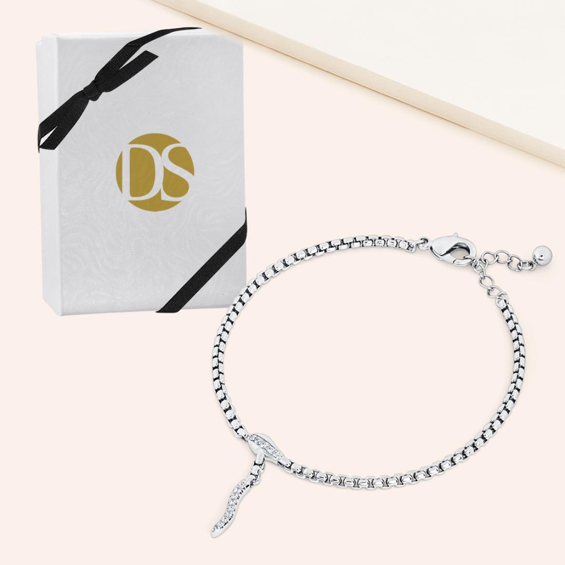 Wrap your wrist in the enchanting charm of the “Serpentia” bracelet, a captivating piece that mirrors the sinuous grace of a snake. Prong-set round-cut stones delicately embellish the rounded box chain, creating a mesmerizing and stylish design. The “Serpentia” bracelet is a symbol of timeless allure and makes for a thoughtful and stylish gift or a distinctive addition to your own jewelry collection.