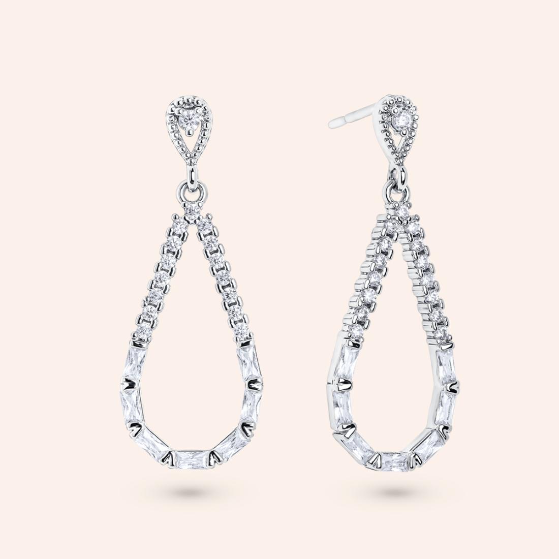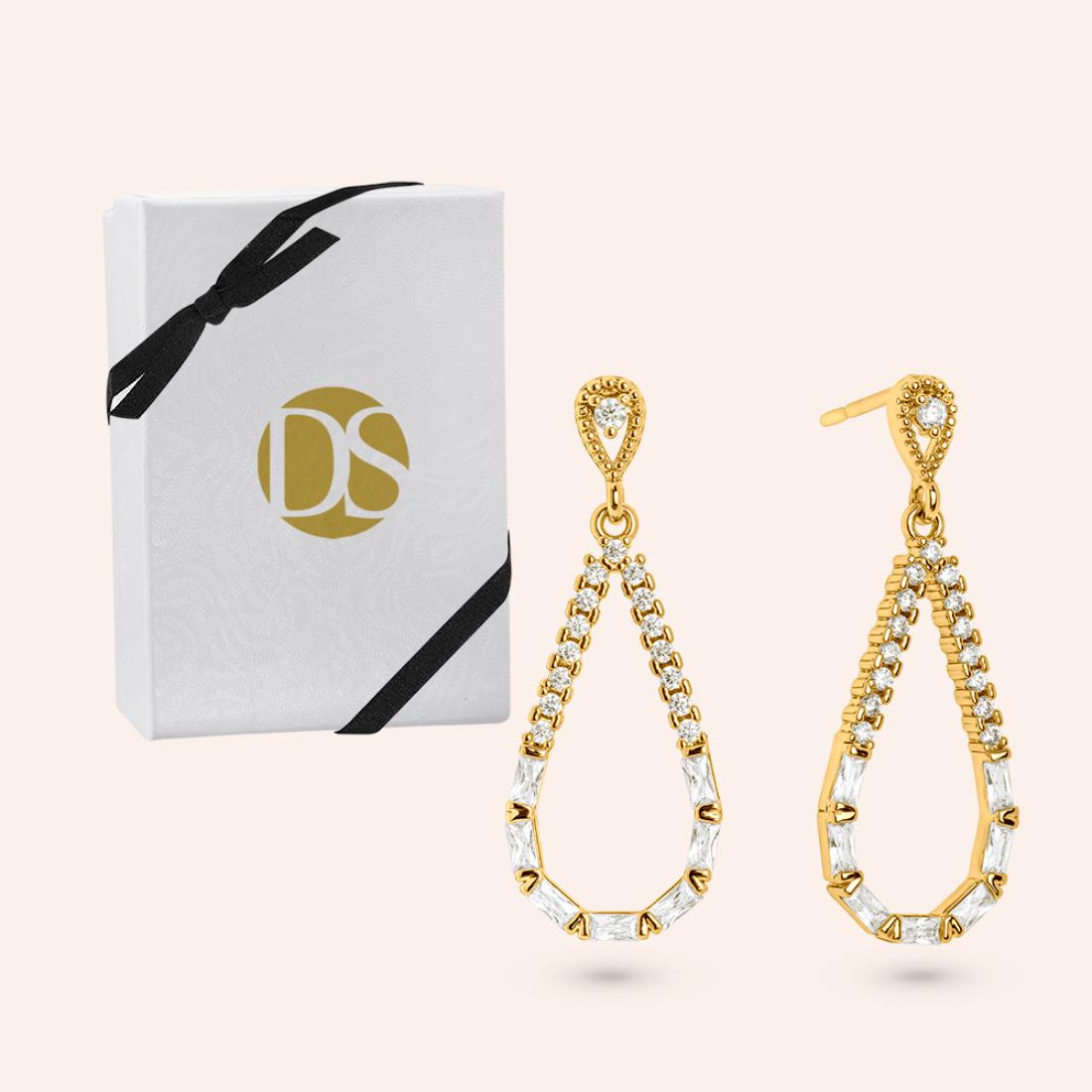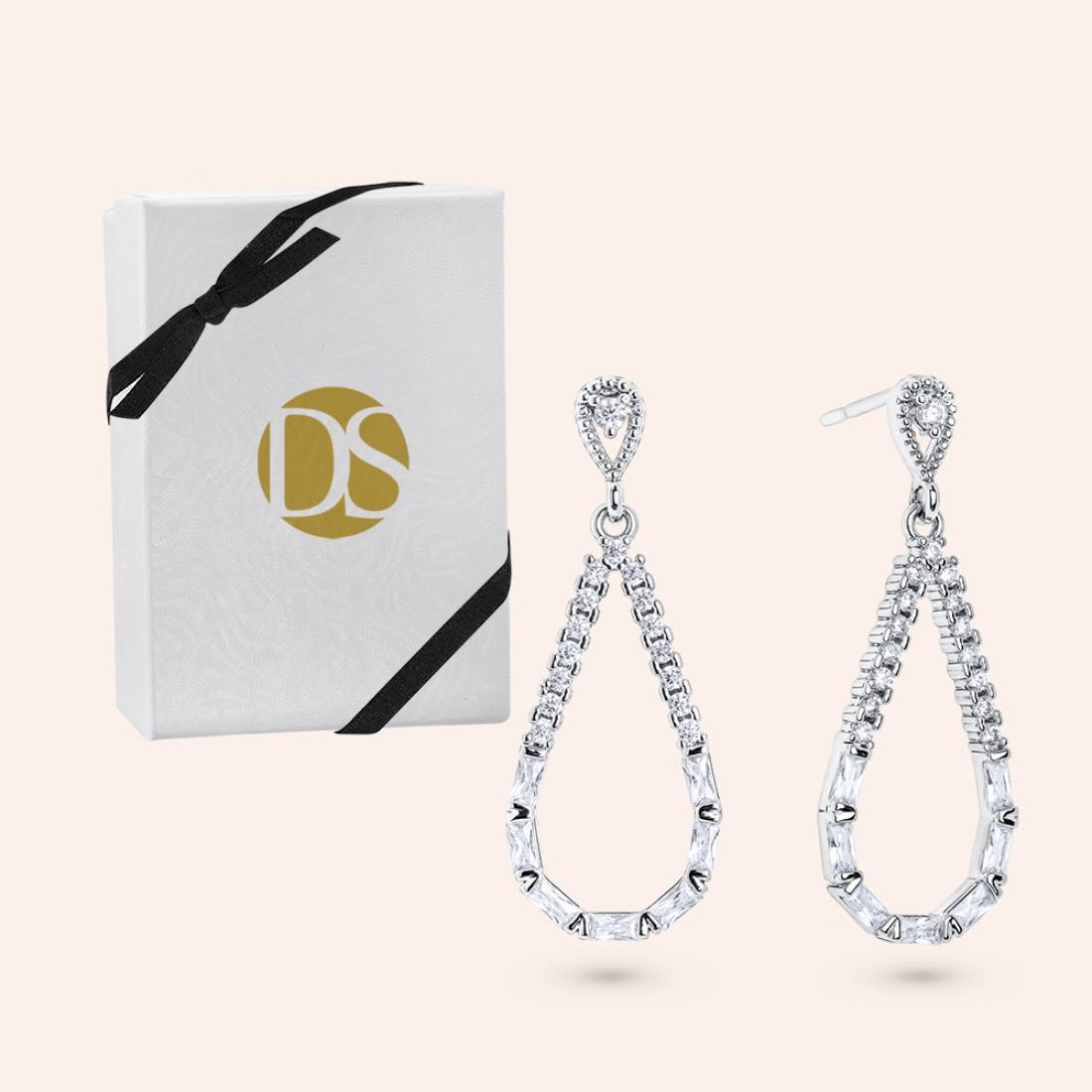 The intricate arrangement of round and baguette-cut stones brings a fresh perspective to classic beauty. As these earrings dangle, they create an alluring play of light and shadows, ensuring you stand out with confident and distinctive style. Elevate your ensemble with a touch of sophistication and a dash of contemporary charm.