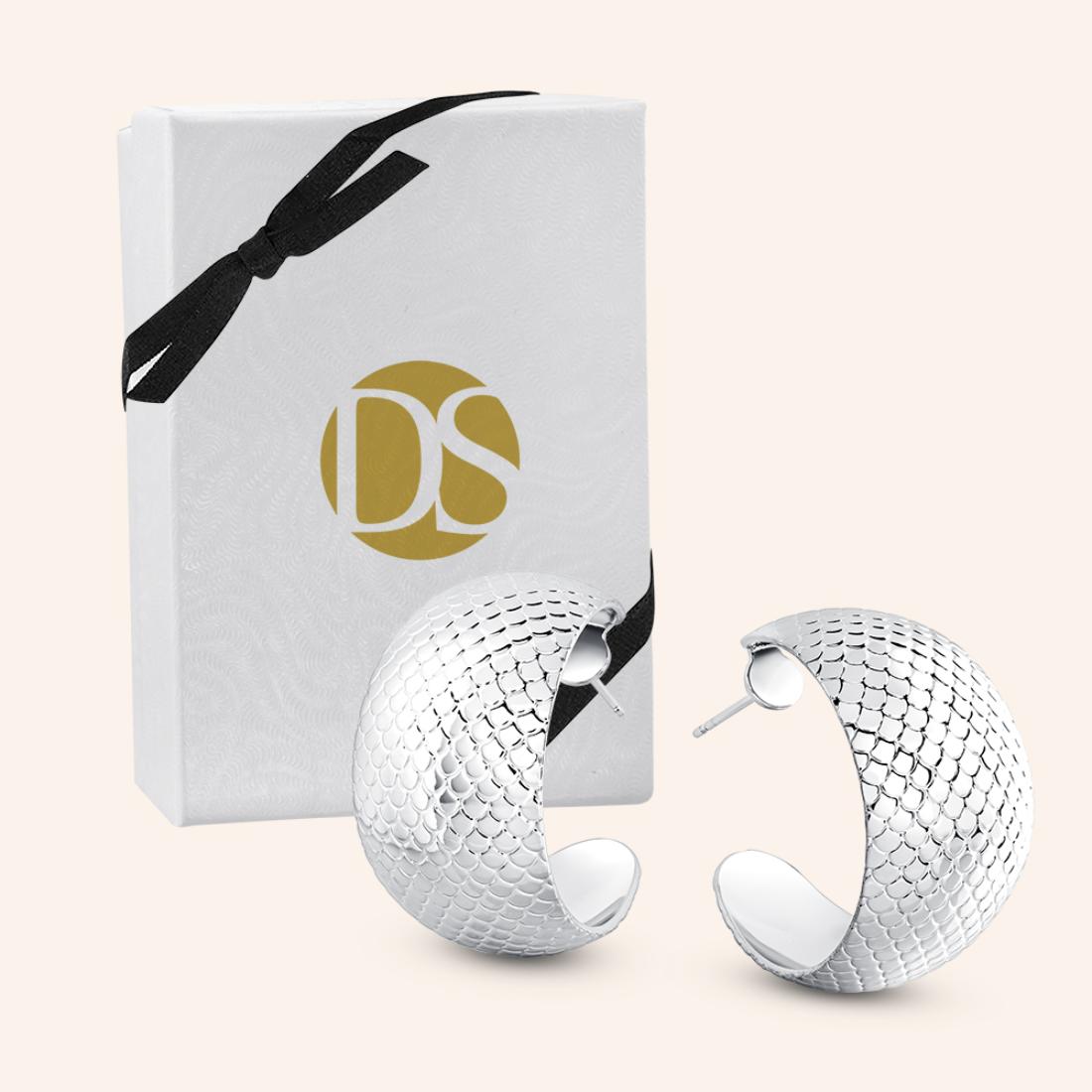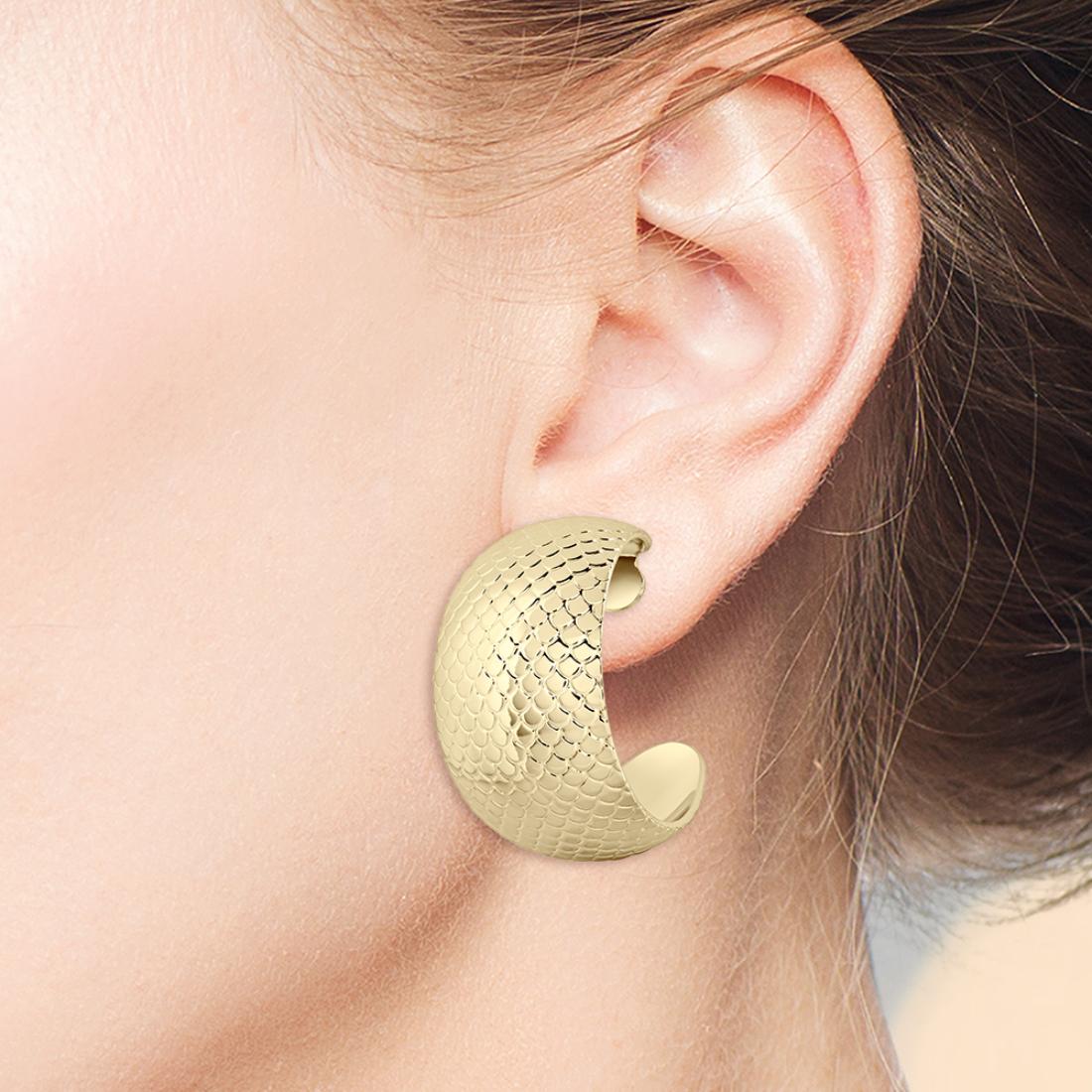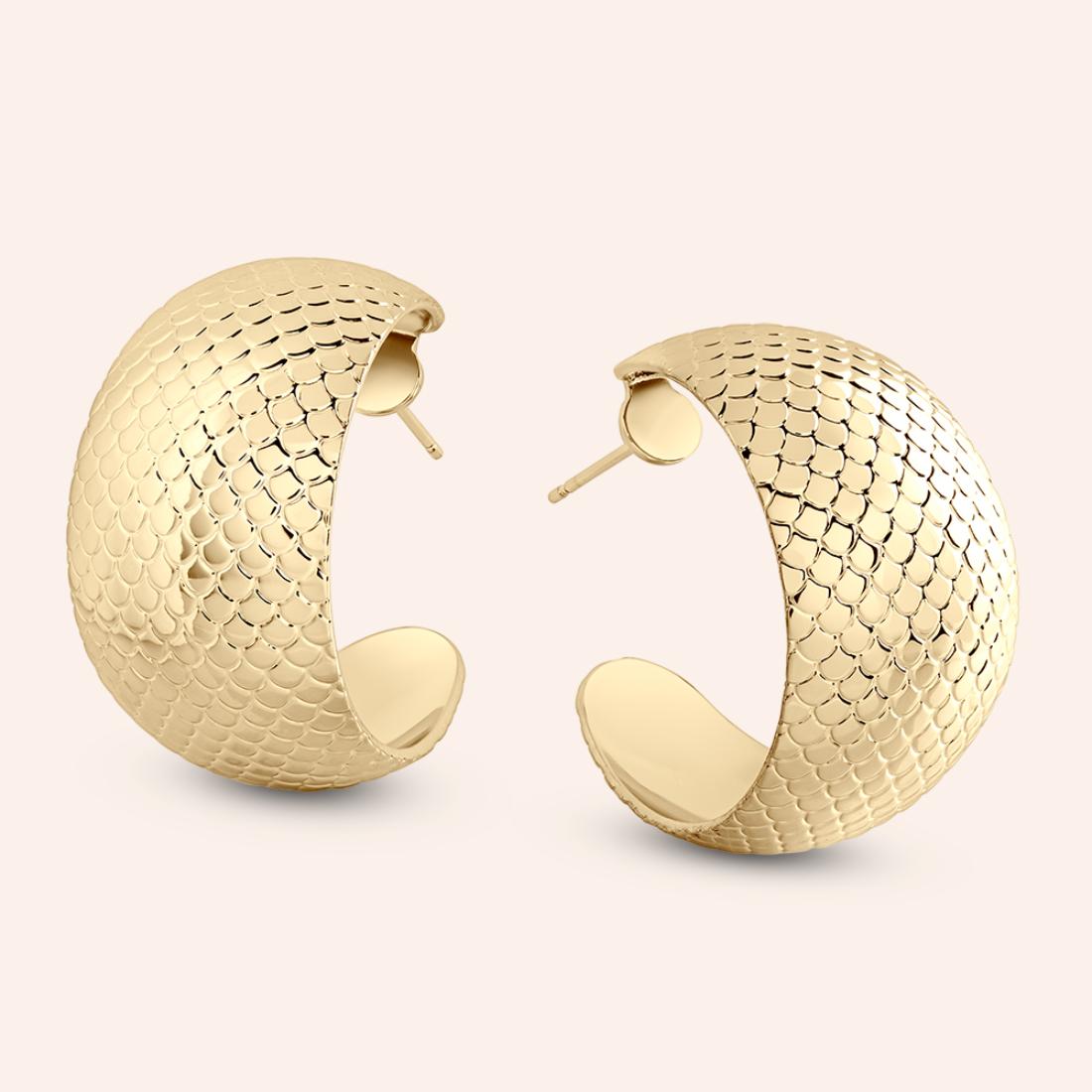 Witness the allure of the splendid jewels that captivate everyone. "Evelyn" is a statement piece showcasing a texture of silver or gold scales surrounding a hoop, designed to intrigue and inspire others with your unique sense of style.
