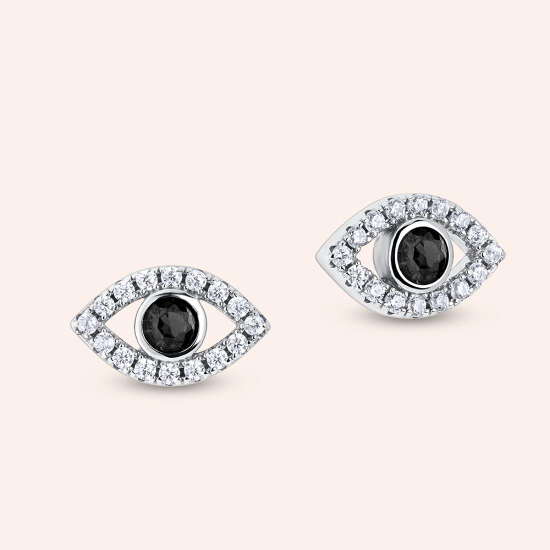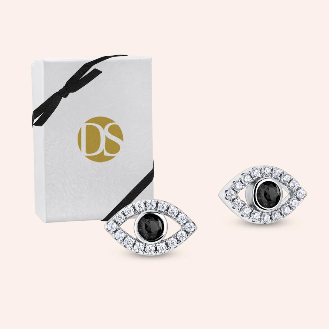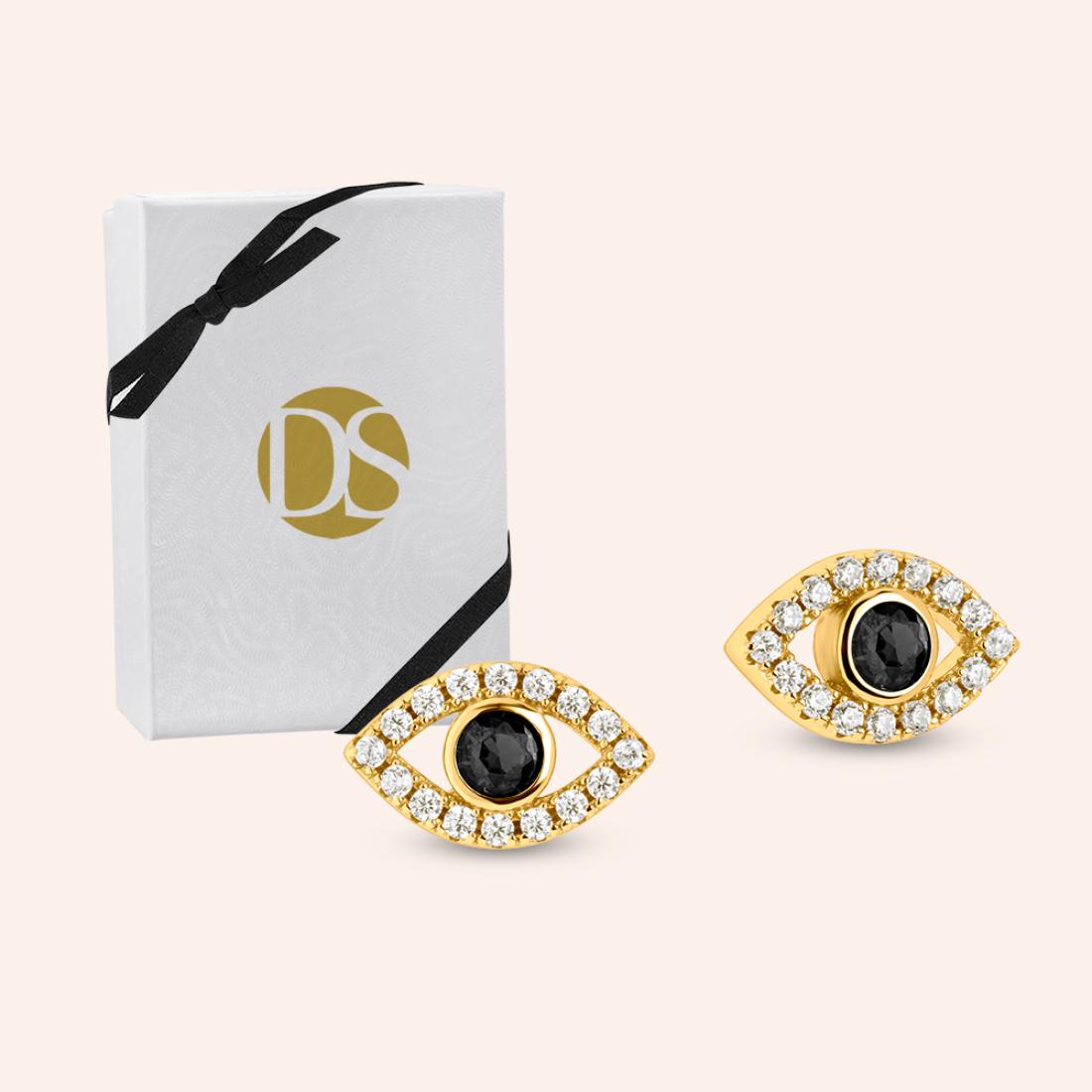 "The 'Evil Eye' gazes outward, serving as a shield against negativity and harm. These eye earrings possess an elegant and stunning paved look that enhances the beauty of your ears, evoking an aura of magic and mystery while also symbolizing good luck.