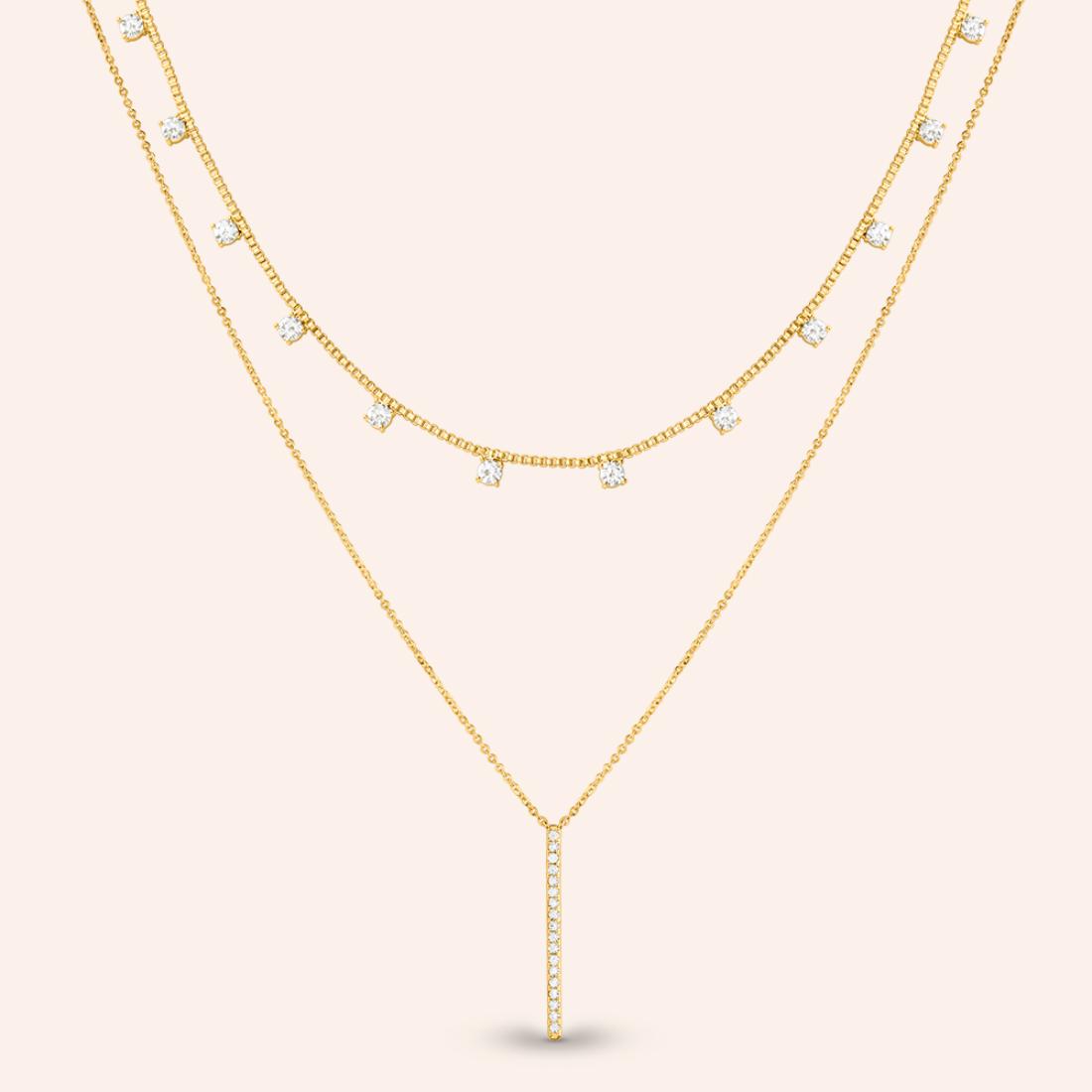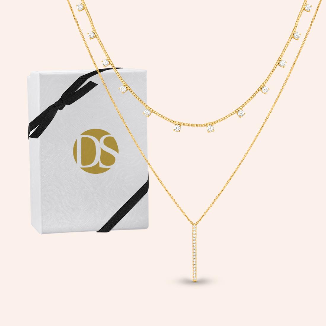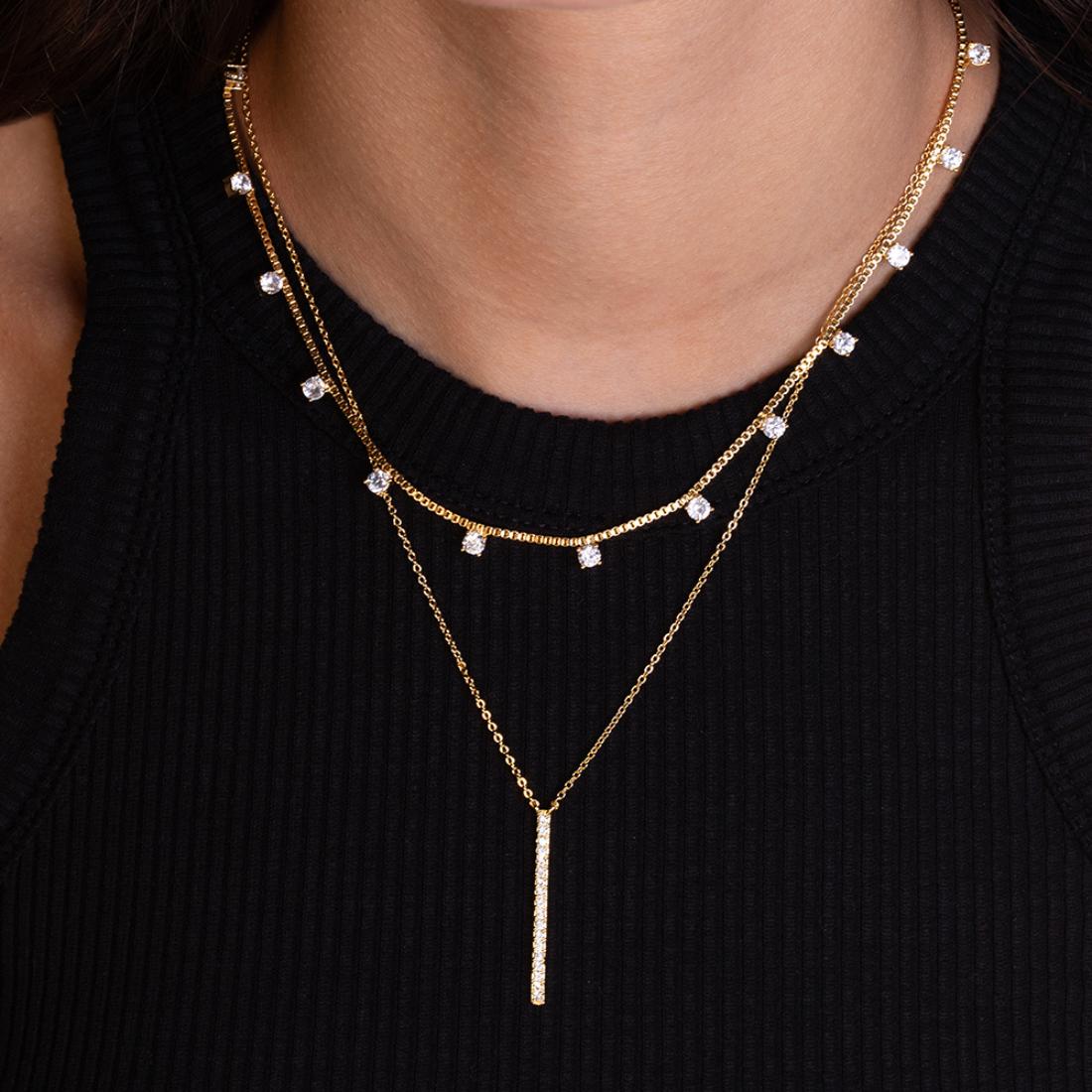 Discover the perfect pairing of elegance with the Anahi Necklace set, a tale of contrasting beauty that complements your every mood. The first necklace presents a stationed stone design, where captivating gems gracefully rest along the chain, creating an understated yet radiant allure. In contrast, the second necklace features a vertical bar pendant adorned with a shimmering pave, infusing your style with modern sophistication. Together or apart, this set is a versatile treasure that empowers you to curate your own unique narrative of elegance and charm.