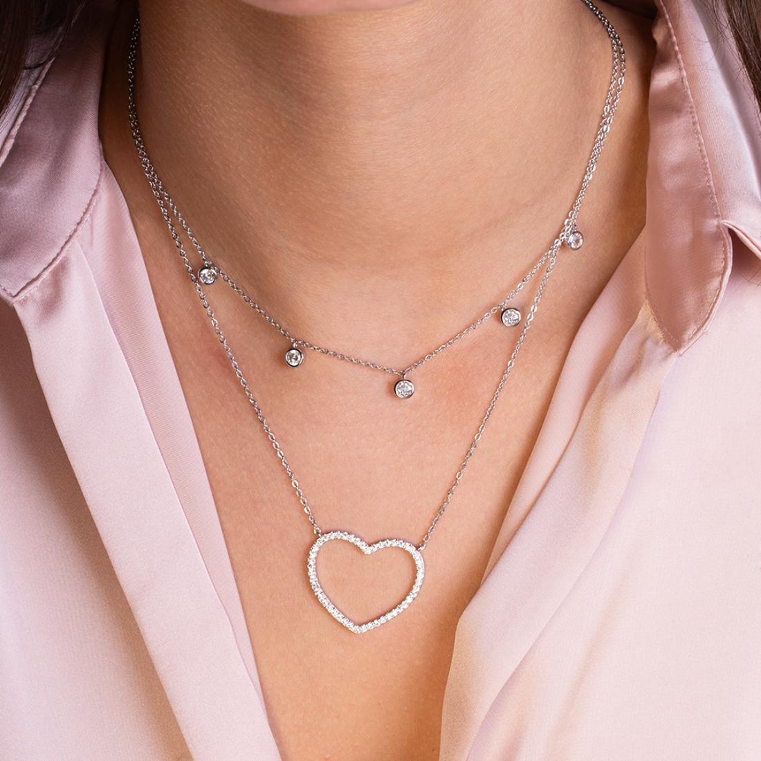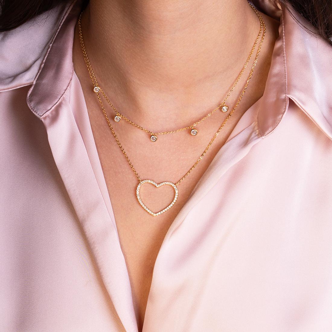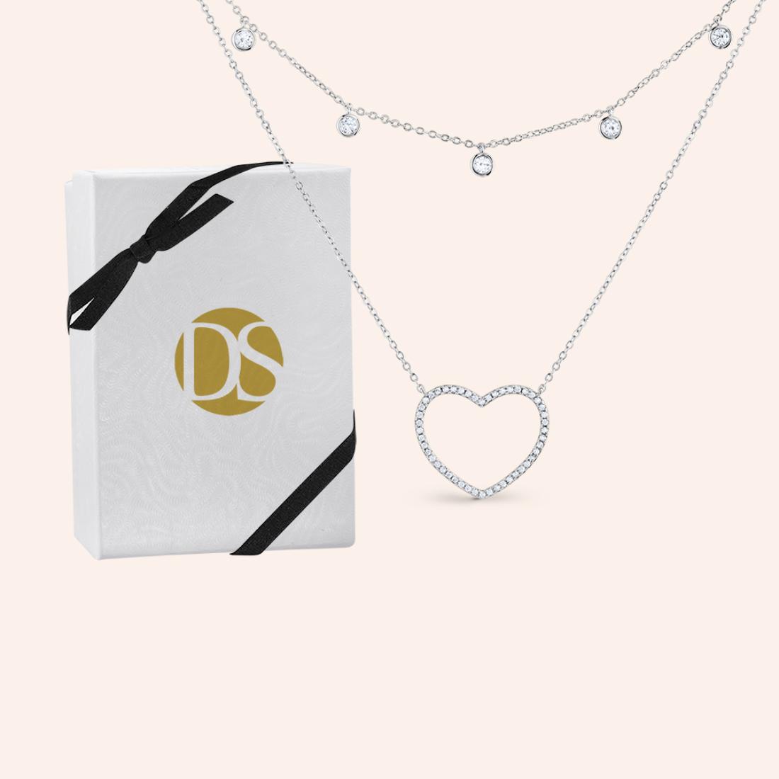 Introducing a duet of elegance and enchantment, the Dakota Necklace Set presents a symphony of style. The first necklace boasts an open heart pendant, intricately studded with pave-set stones, capturing the essence of love's sparkle and warmth. Complementing this, the second necklace features stationed bezel-set stones that stand as beacons of radiance along the chain, adding a touch of brilliance to your neckline. Wear them in harmony or let each piece tell its own story – this set is your invitation to embrace versatile elegance with a creative twist.
